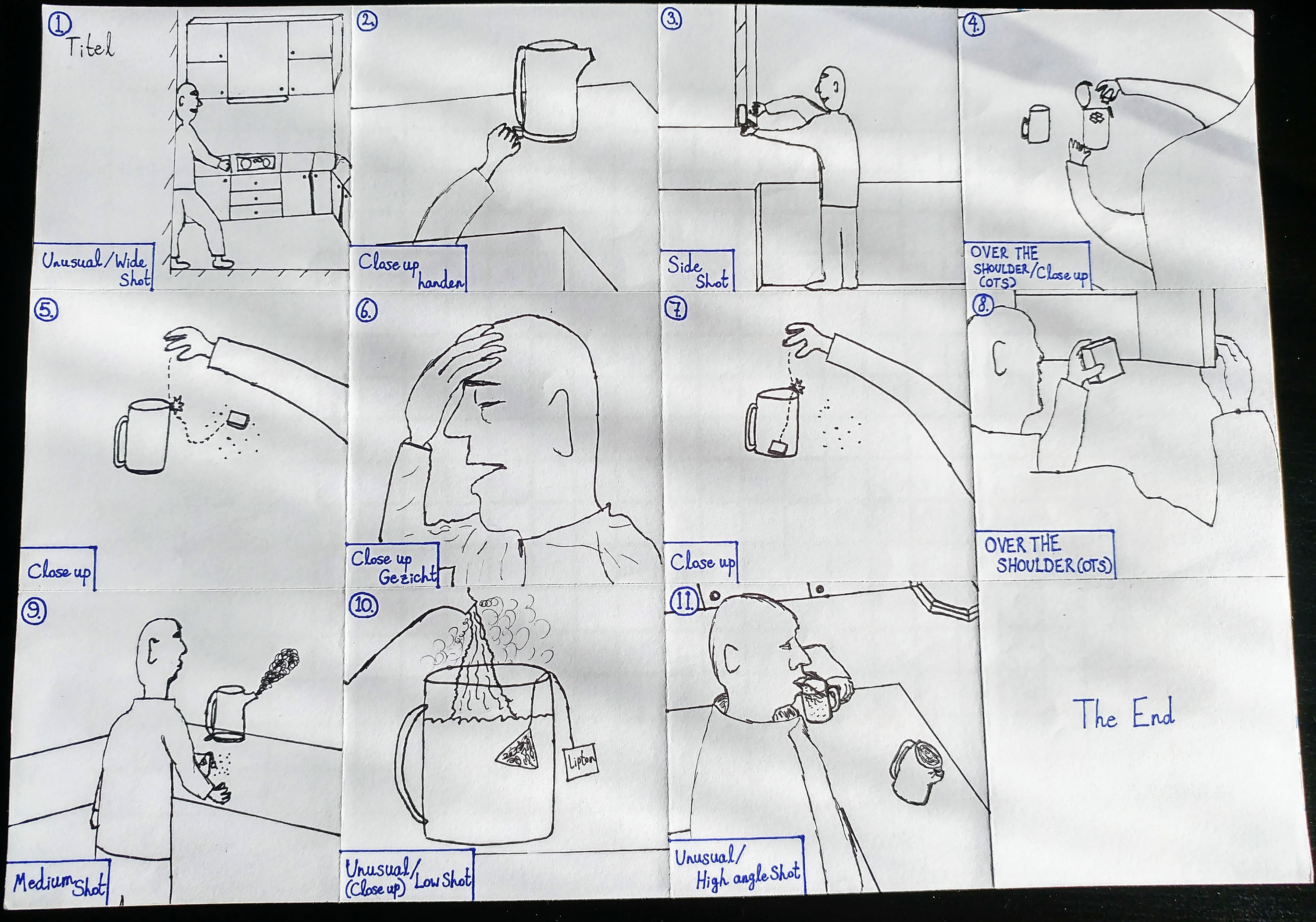 As part of an audio‑visual design course, I explored various types of shots common used in audio-visual production. To demonstrate this, I developed a comprehensive storyboard in which each scene is annotated with the corresponding shot type (highlighted in blue in the lower left corner).