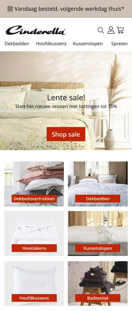 One of the requirements was to adhere to a specific primary color (HEX Color Code: #CCC2B8) that matched Cinderella.nl’s brand identity. In addition, the readability of the old website/application needed improvement, with particular attention to the six main categories used by Cinderella.nl, which had to be clearly visible in the new design.