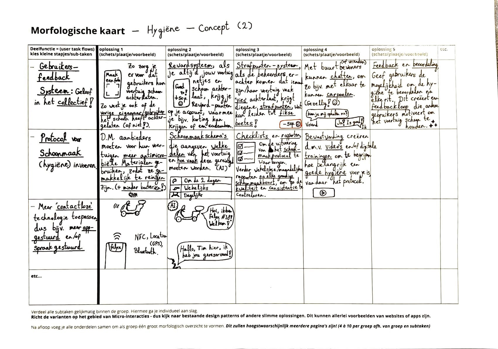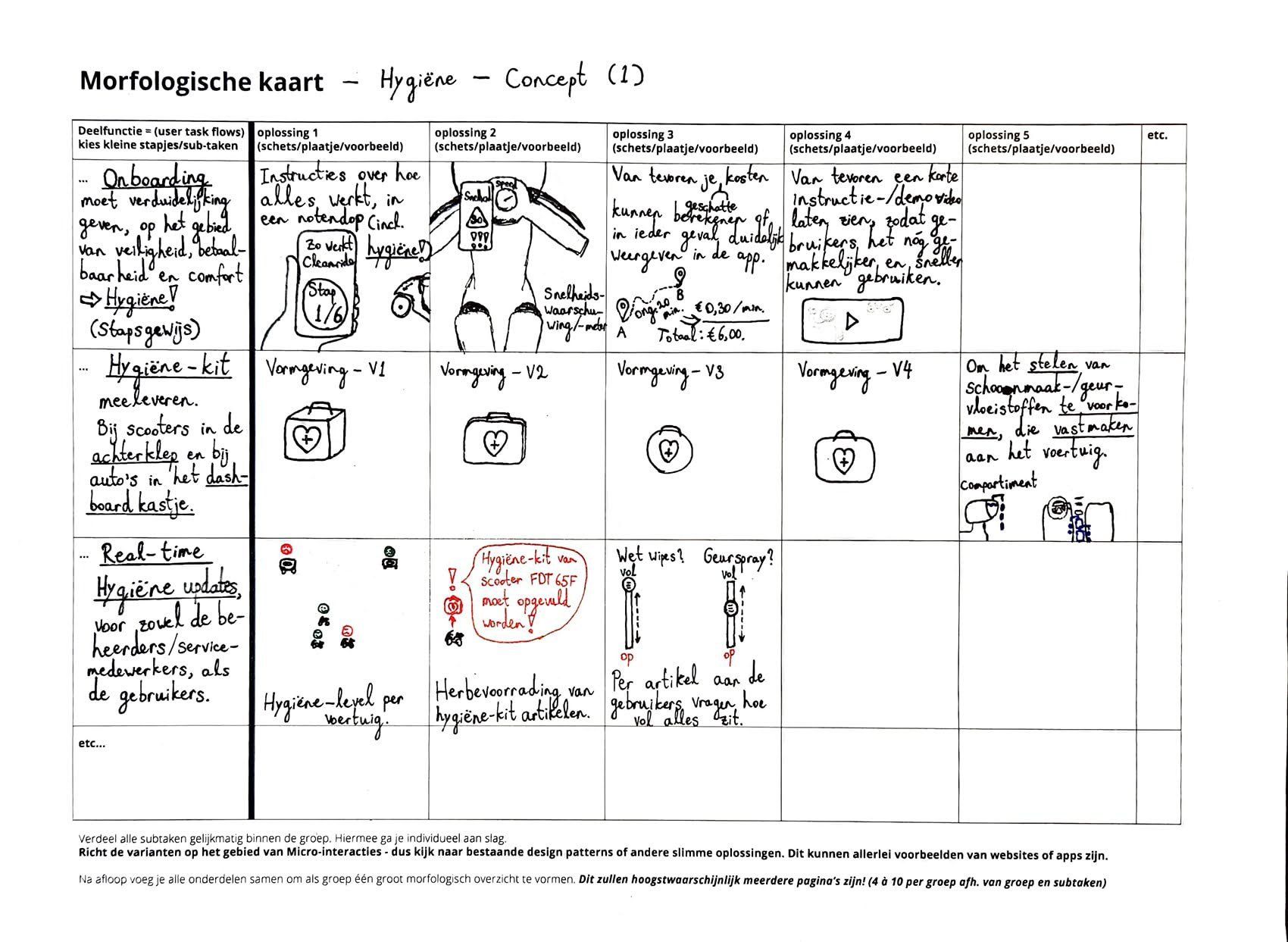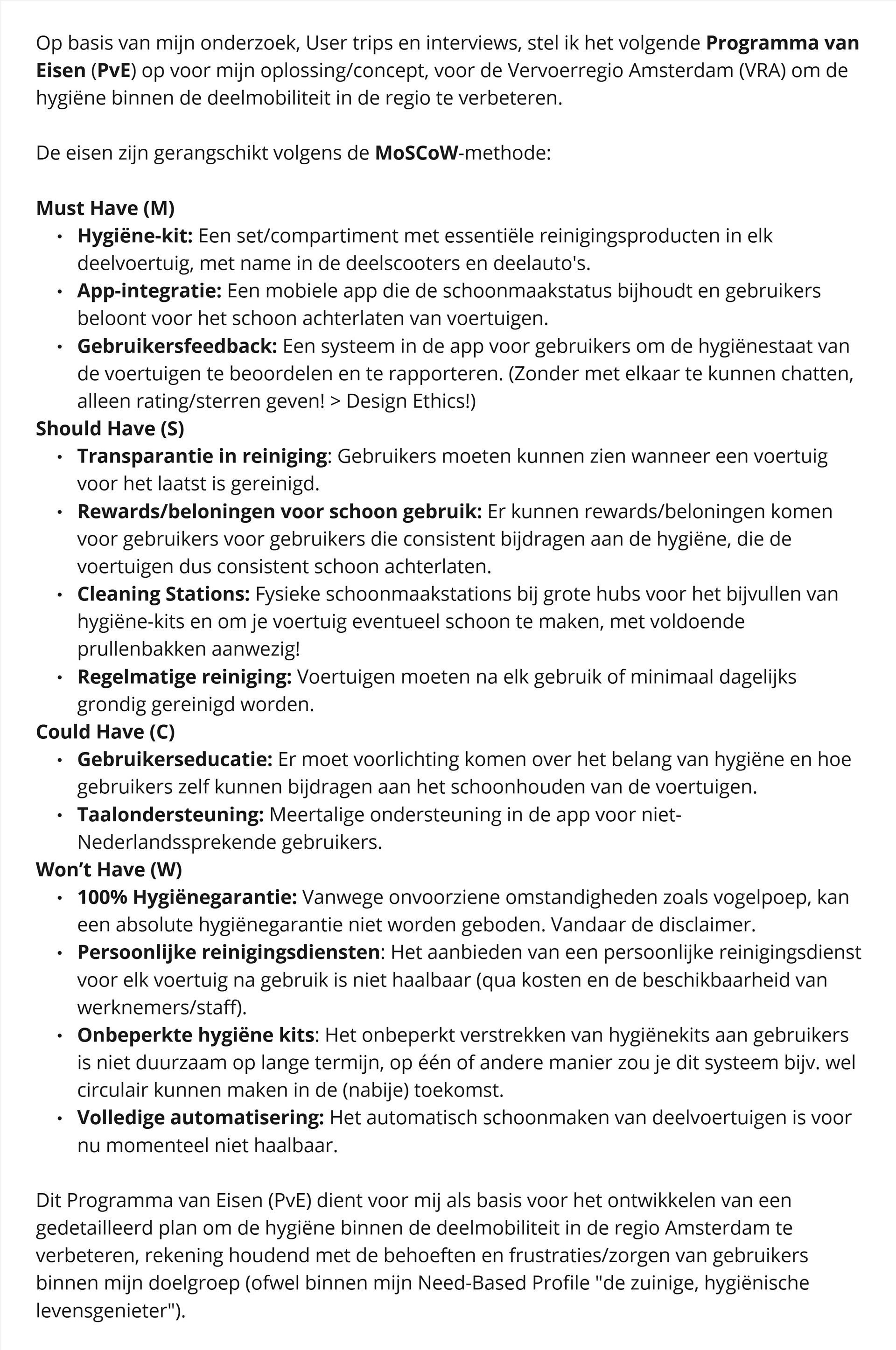 Throughout this project, I conducted extensive research into the current pain points and needs of shared mobility users. Through interviews, user trips, and desk research, I gathered valuable insights that contributed to the development of a Customer Journey Map, a Need‑Based Profile, a Stakeholder Map, and, last but not least, a detailed Program of Requirements (PoR or PvE in Dutch). This PoR/PvE, which I prioritized using the MoSCoW method, served as the foundation for the solutions I designed — including the integration of hygiene kits in vehicles and a mobile app that tracks cleaning status and rewards users for leaving used vehicles clean. In addition, I applied several Creative Research methods, such as a concept map (or 'Denkkaart' in Dutch), solution visualization, card sorting, interviewing with a mind map, a morphological chart, and a future scenario/vision for beyond 2035.