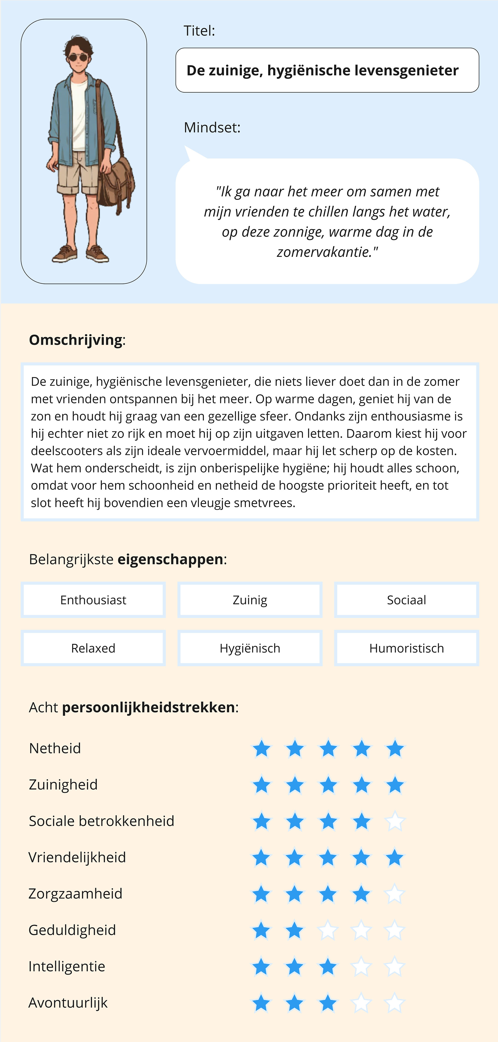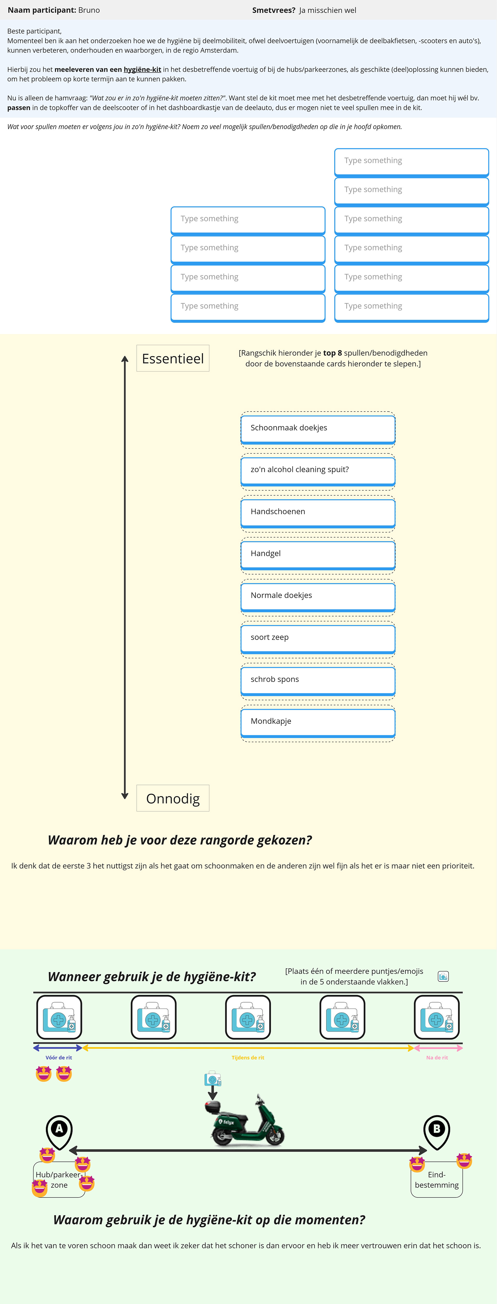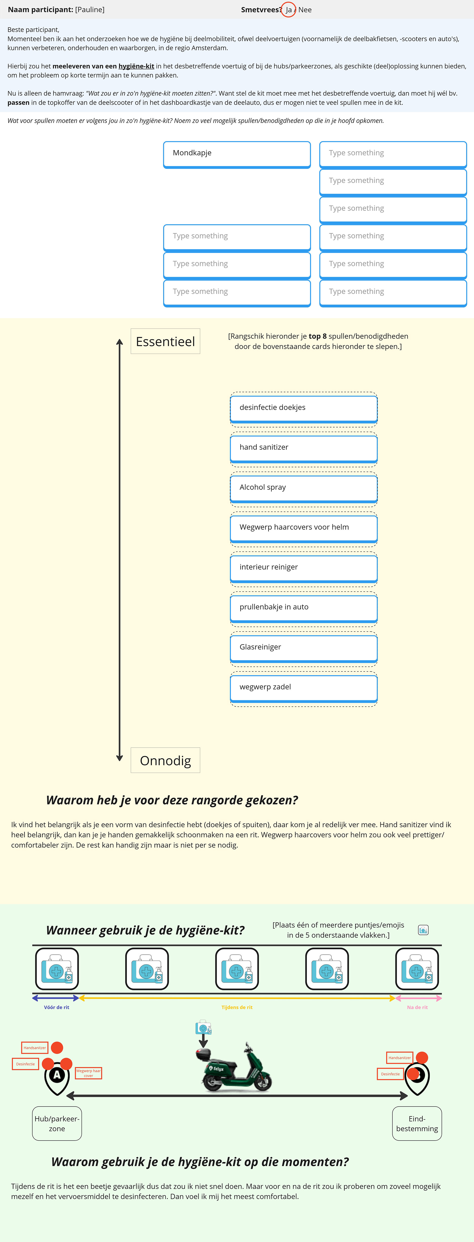 I was able to carry out this method with three shared‑mobility users who fit within my Need‑Based Profile: the frugal, hygiene‑conscious bon vivant (preferably with a germophobia, or 'smetvrees' in Dutch).