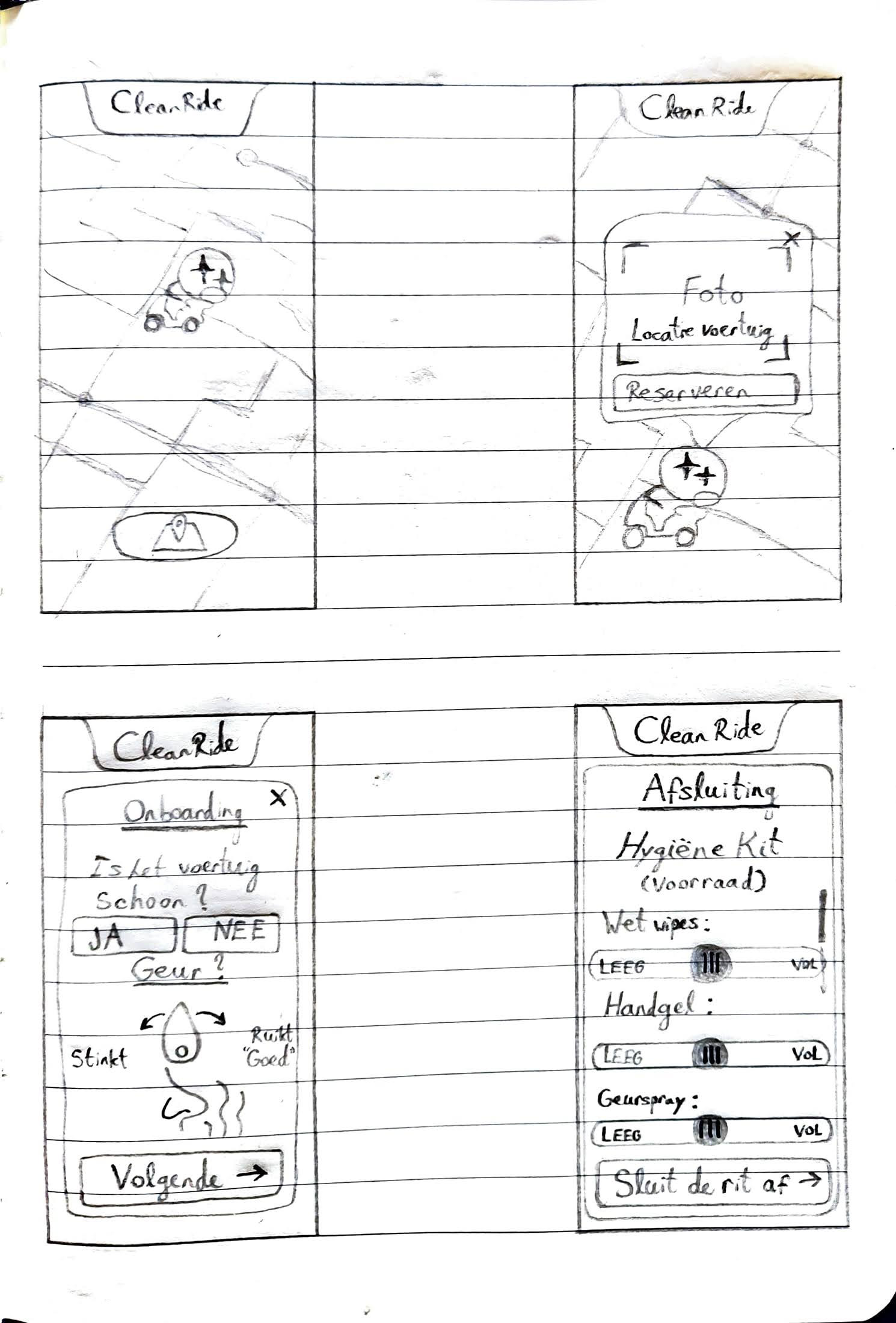 When developing the CleanRide concept, I began (as shown in the image next to this/above) by creating low‑fidelity (Lo‑Fi) sketches to visually capture my ideas and explore how the app’s interface and features could take shape. These sketches served as the first step in the prototyping process, focusing on quickly and easily testing different design elements without the constraints of detailed, visually polished designs.