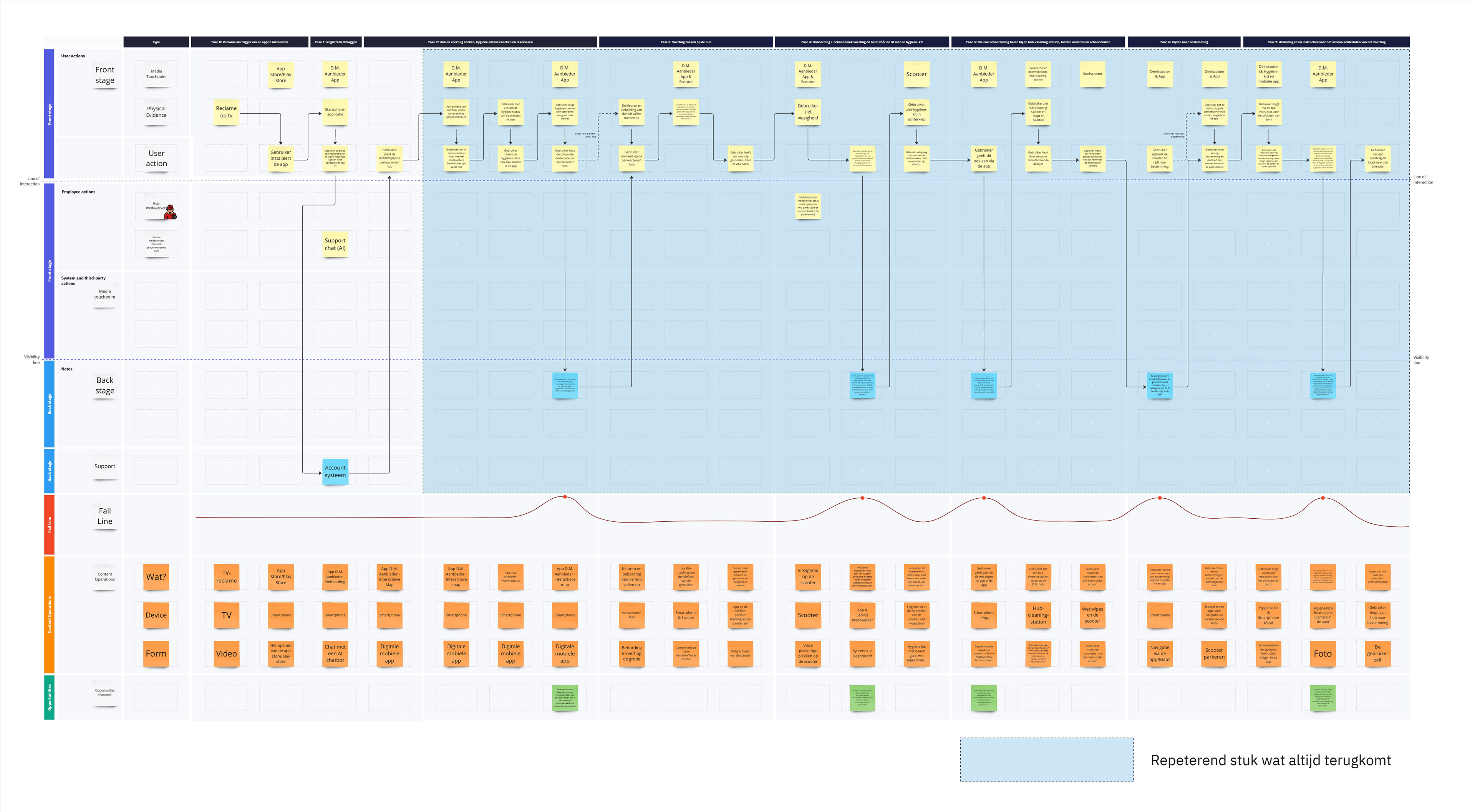 The Service Blueprint (SB), like a Customer Journey Map, is also a chronological map, but a Service Blueprint (SB) describes more about how the system works/operates. So, in addition to the front stage, the focus is placed on the back stage of a service — for example: 'What happens with the data?' — with less focus on the user experience itself.