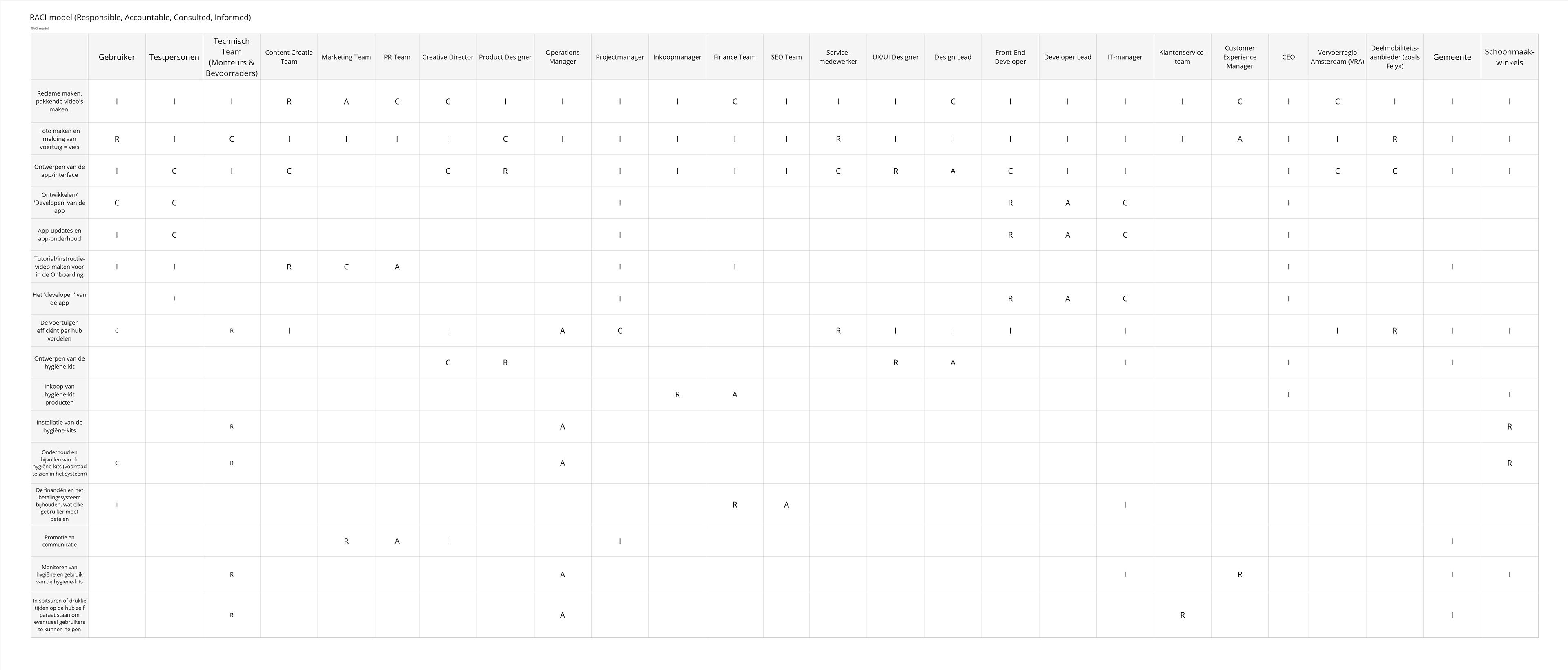 The RACI model contains a chart listing everyone involved in the project along with their role and responsibility, indicated in the chart as: Responsible (or 'verantwoordelijk' in Dutch) (R), Accountable (or 'eindverantwoordelijke' in Dutch) (A), Consulted (or 'geraadpleegd' in Dutch) (C), or Informed (or 'geïnformeerd' in Dutch) (I). (As shown below.)