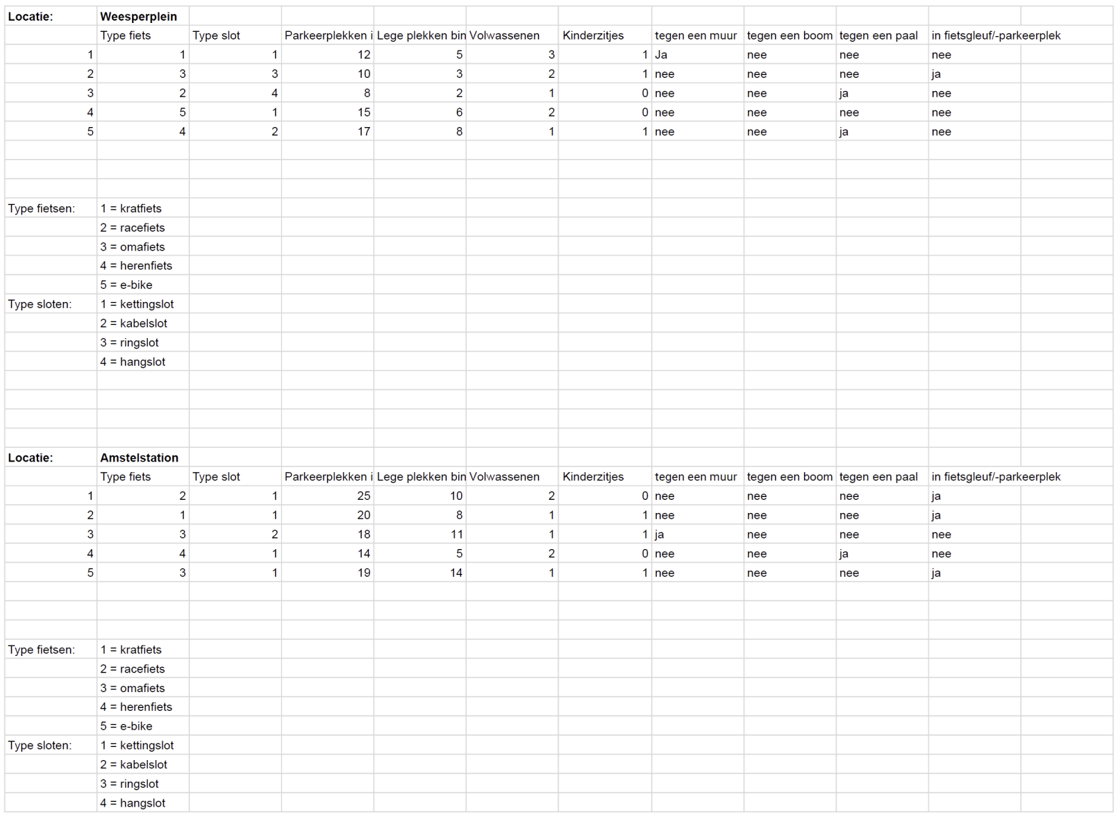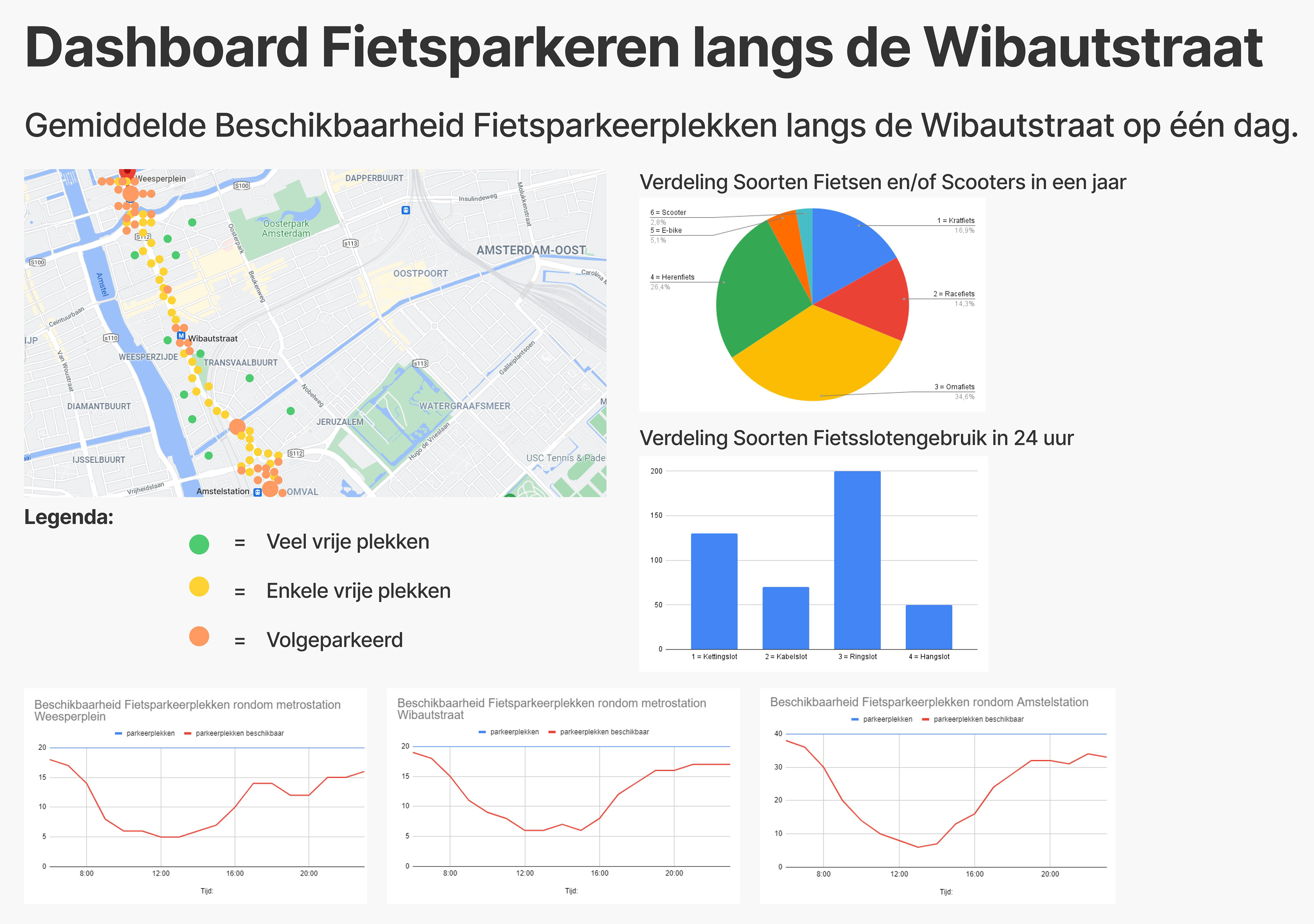 Using fictitious data, I was able to create data tables as shown below. As illustrated in the dashboard above, which was built using this data below, I distinguished between three stops/stations along the Wibautstraat. Around which station, at what exact location, and at what time are bicycle parking spaces available? This useful information can be read directly from the graphs in the dashboard above.