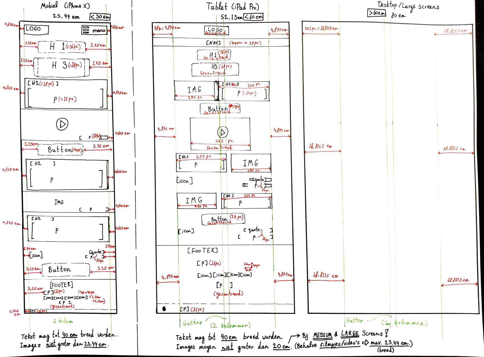 The first step was to create a breakdown sketch, taking into account the viewports of each device. We also worked with a grid system that we were free to choose. I selected a two‑column grid, as this was the most suitable option given the content provided by the client, Gemeente Rotterdam, or the Municipality of Rotterdam in English.