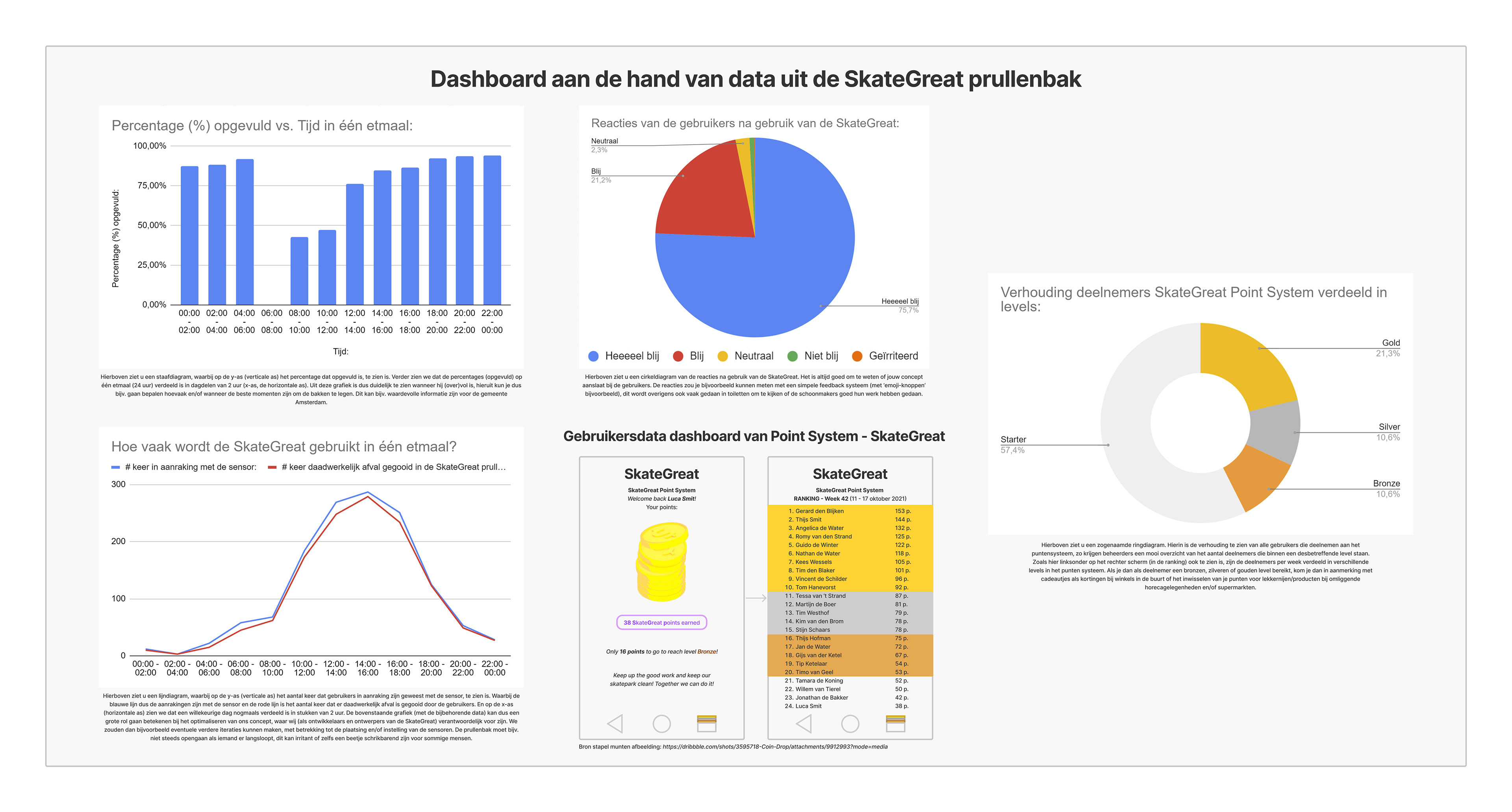 Above is a dashboard with data visualizations, created and designed by me. It was developed for the future administrators of this concept, to support content operations (the back-stage of the company). The concept for this project was an interactive trash bin aimed at reducing litter in the area around Skatepark Zeeburgereiland in Amsterdam. The data shown here was taken from a (fictional) database in the form of an Excel file, which records, among other things, user feedback, how full the bin becomes within a single day, and how often it is actually used. Finally, I also created and designed a reward points system for loyal users, including several screens to illustrate how this system could look. With these reward points, users could, for example, receive discounts for events and/or nearby catering establishments.