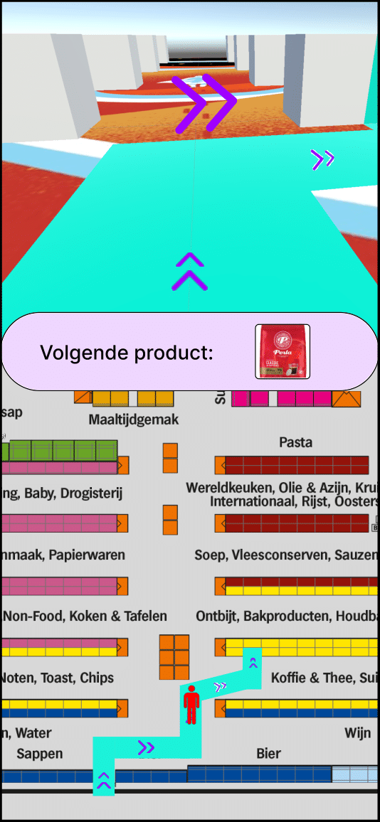 The added value is that the Speedy Errands AR app provides the user with a clear overview of product locations in (unfamiliar) supermarkets. The app generates a route based on the uploaded shopping list, with the items organized according to their exact position in the store and on the shelves. As a result, the user avoids unnecessary searching and inefficient back‑and‑forth movement through the supermarket.