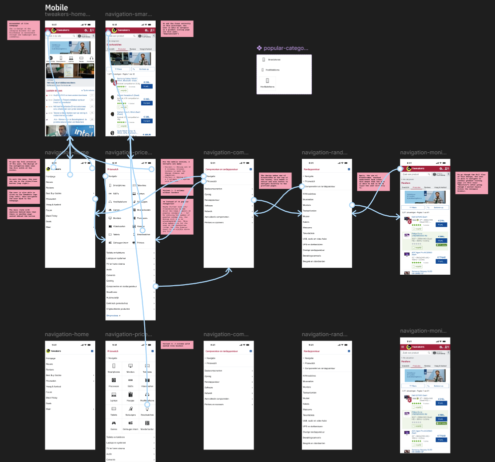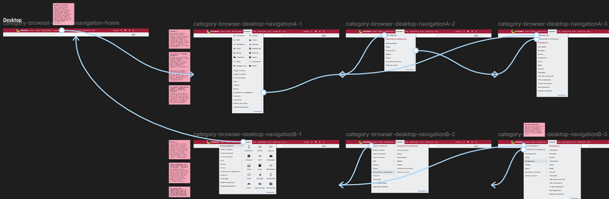 • Desk Research & Benchmark Analysis: I conducted UX research into best practices for category browsers, collecting examples from both national and international (non-Dutch) platforms such as Bol.com, Coolblue, and Amazon. I documented these findings on a large annotated Figma artboard, eventually compiling dozens of examples of category browsers and similar navigation patterns. I mapped out the ideal (happy) flow for both mobile and desktop/tablet versions and annotated key insights along the way.