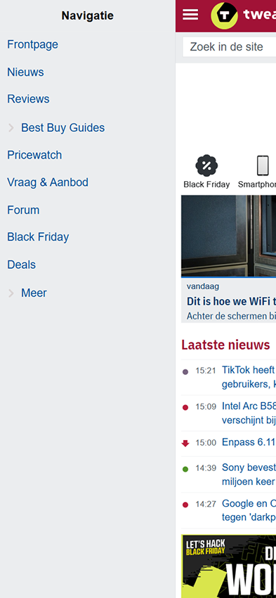 Current version of the Tweakers Category Browser on mobile, accessible via the navigation bar or through a horizontal slider with icons (see the image beside/above).