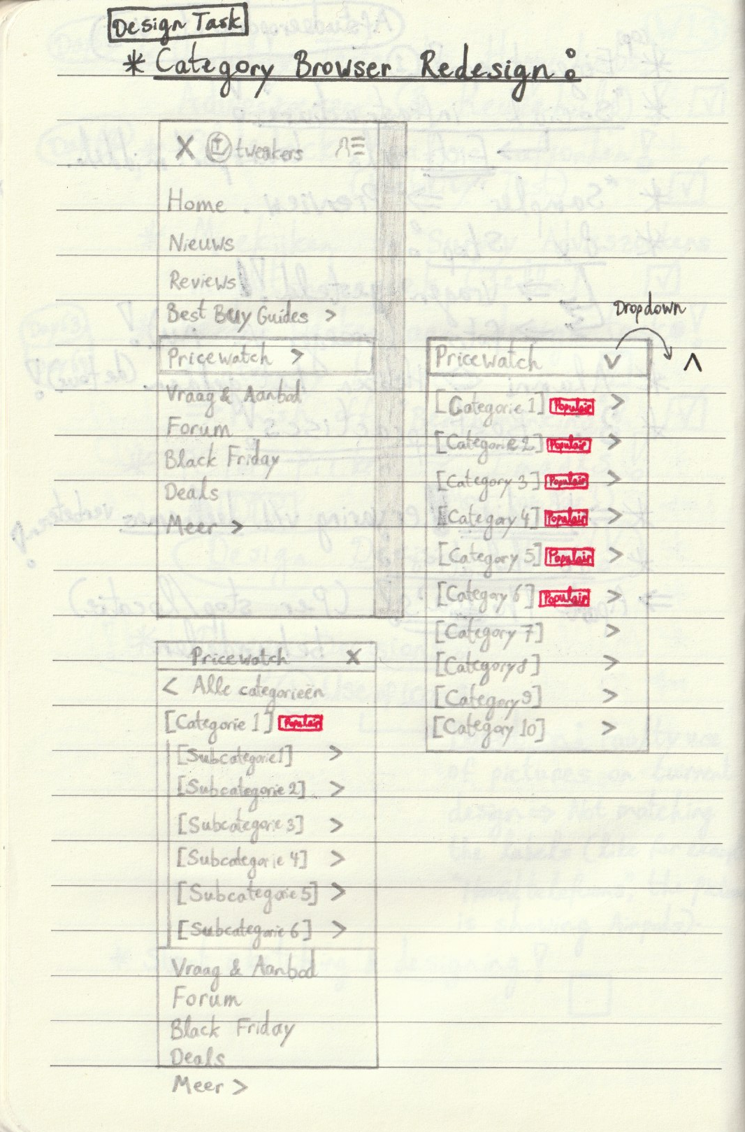 The first Lo-Fi sketches of my initial concept/designs on mobile. These early sketches differ from the final interactive Hi‑Fi prototype in Figma — for example, the ‘Popular’ (or ‘Populair’ in Dutch) labels were removed later in the process, as they added unnecessary visual noise to the navigation and the information was already available within the menu in the final iteration.
