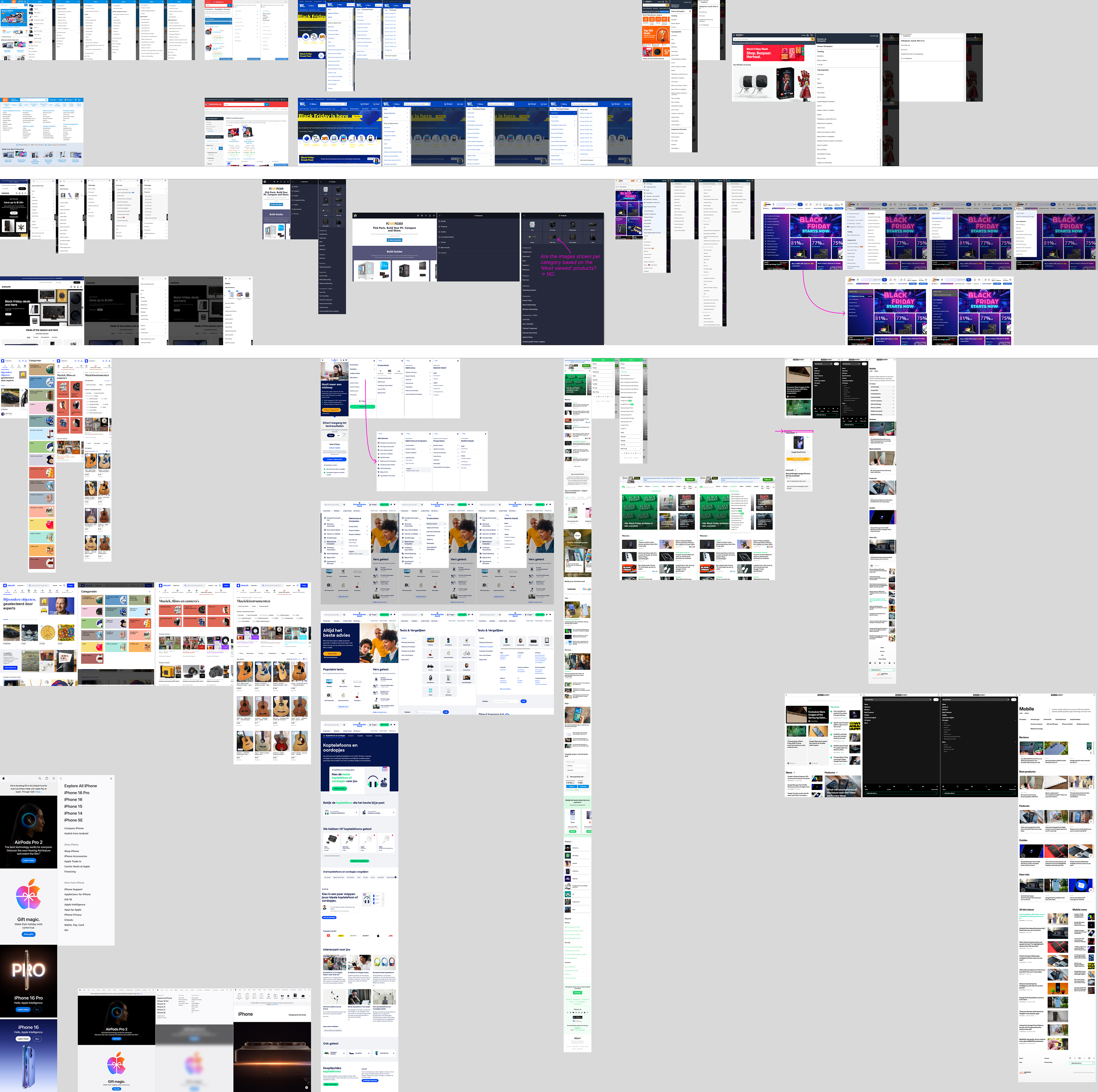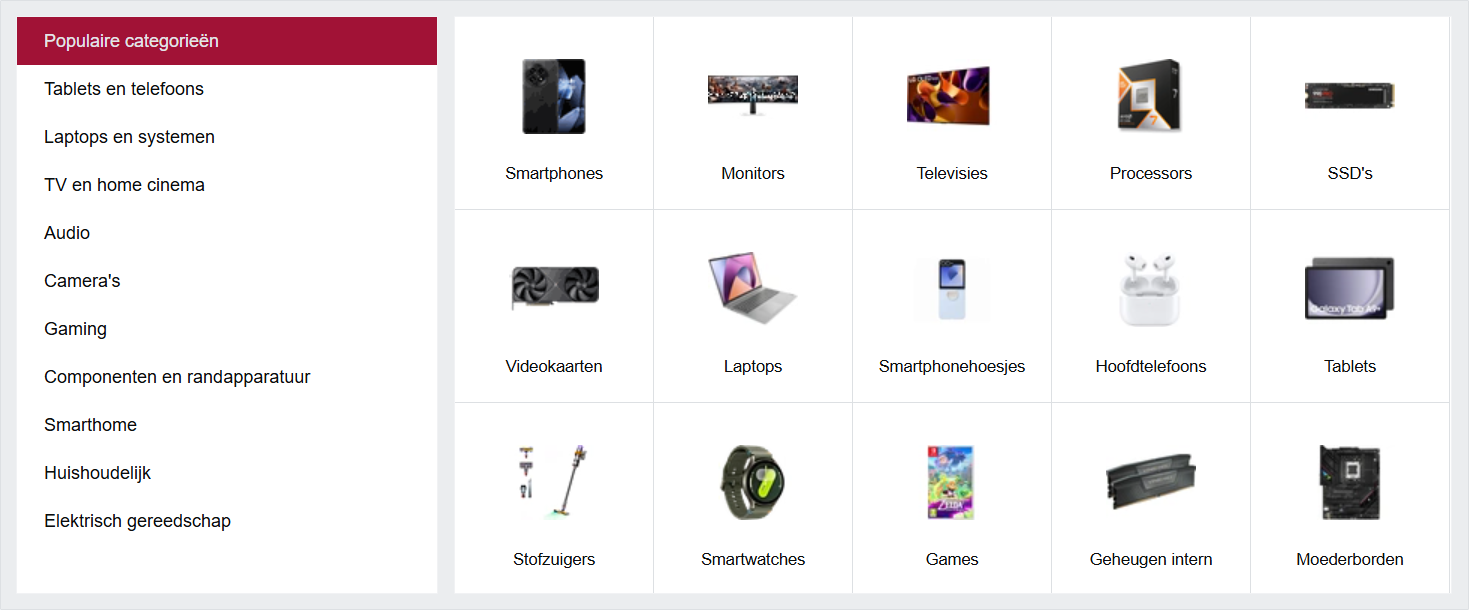 The current (or then previous) Category Browser was difficult to find because it was hidden behind the ‘Pricewatch’ button in the top navigation bar. This reduced its discoverability and disrupted the user flow. In addition, the visual representation of categories caused confusion. For example, the ‘Headphones’ (or ‘Hoofdtelefoons’ in Dutch) category displayed an image of Apple AirPods — the most popular product — while users expected a more traditional headphone image. This mismatch created a misleading impression and negatively affected recognition.