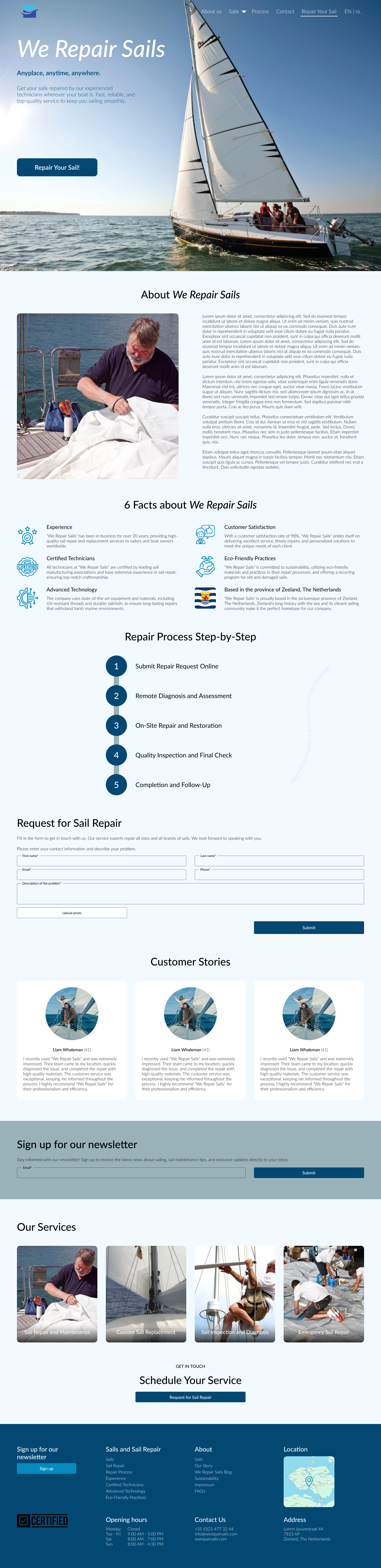 ‘We Repair Sails’ is a company based in Zeeland, the Netherlands, that repairs boat sails. Because the market in the Netherlands is relatively small, they want to expand internationally with a clear motto: Anyplace, anytime, anywhere. Through a new website, they want to offer customers the ability to easily and quickly request sail repairs, no matter where in the world their boat is located. The development of the full platform is planned for a few months from now. For the moment, they want to get an informative one‑page website online as soon as possible — and they still need a design for it.